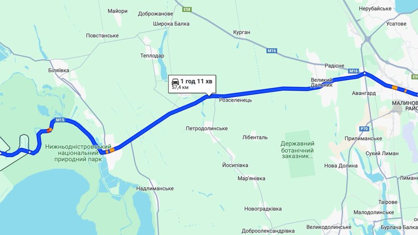 Наразі у бік пункту пропуску "Паланка — Маяки — Удобне" є затори на виїзді з Одеси, на КПП та у межах природного парку. Дорога до Паланки сьогодні становитиме 1 годину 11 хвилин.