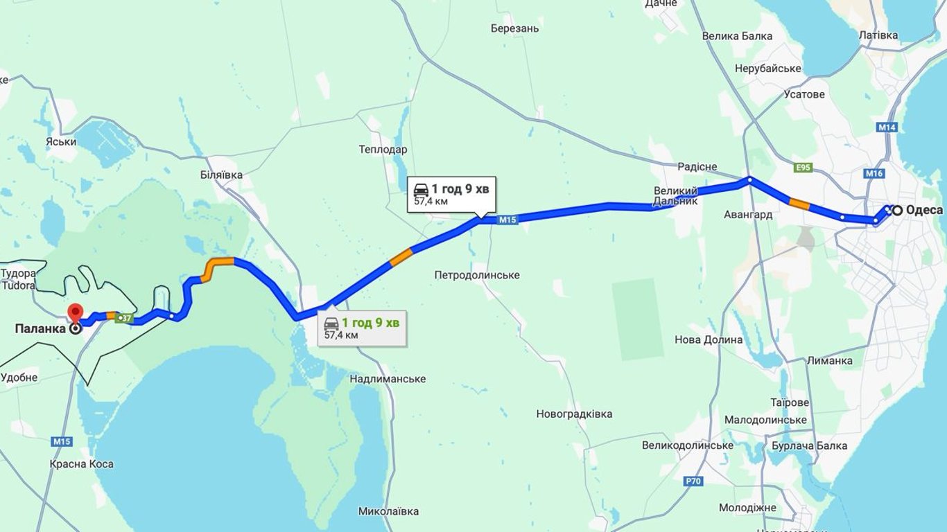 Наразі у бік пункту пропуску "Паланка — Маяки — Удобне" є великий затор у районі природного парку та обох пропускних пунктів. Ця ділянка на картах позначена червоним та жовтим кольором. Подорож до Паланки триватиме сьогодні 1 годину 9 хвилин.