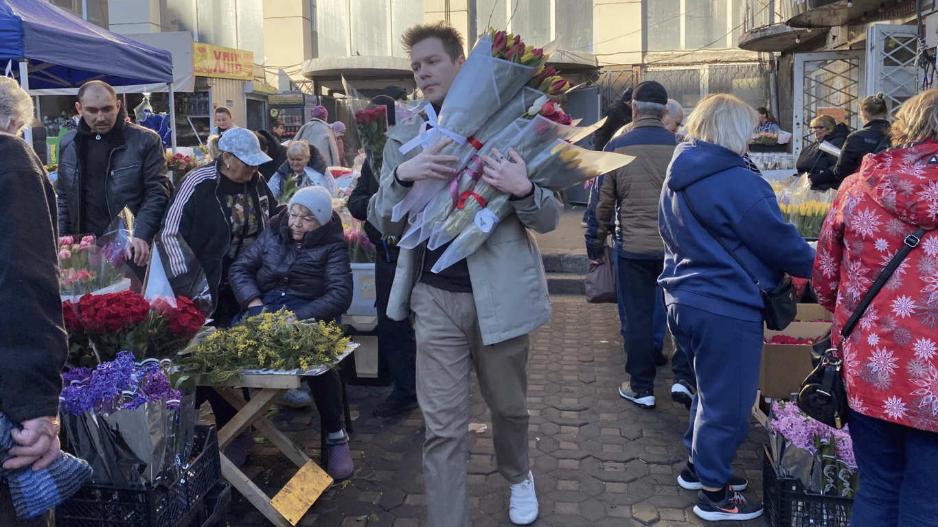 З самого ранку чоловіки вирушають на ринки, щоб обрати найкращі букети для мам, бабусь, дружин і коханих. Максим, який приїхав з Київщини, розповідає: