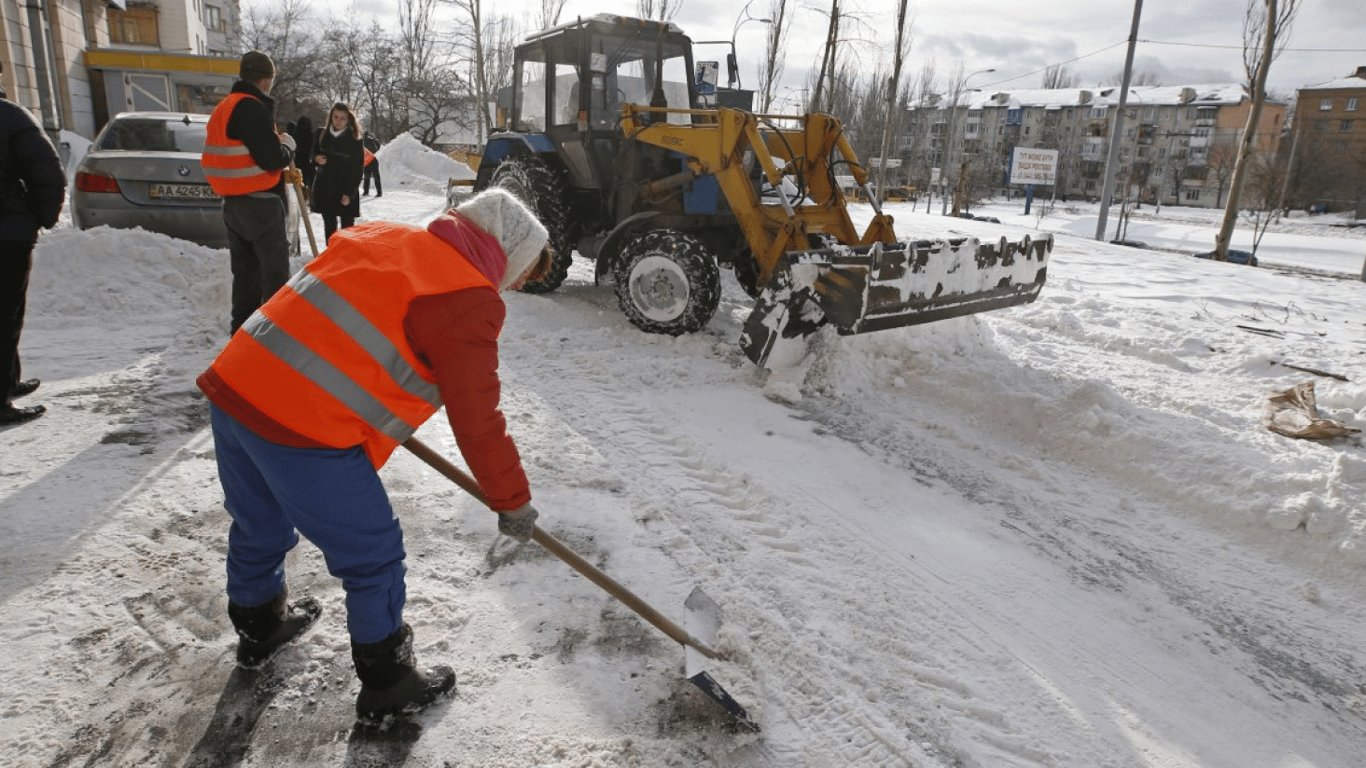 Очищення проїжджої частини дороги від снігу трактором, обладнаним відвалом.