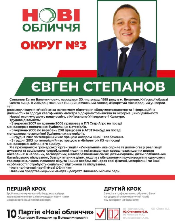 Тобто якийсь політичний мотив цей ролик все ж має. Нам вдалося дізнатися, що Євген Степанов пов’язаний з політикою - 5 років тому його обрали депутатом Вишневої міської ради. За його словами, на цій посаді він хоче провести благоустрій у рідному місті: відремонтувати всі ліфти, встановити нове сучасне освітлення, встановити лавки та зробити місця для відпочинку жителів міста.