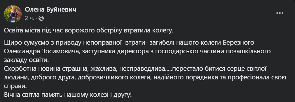 За її інформацією, загиблий — Олександр Зосимович Березний. Чоловік був заступником директора з господарської частини позашкільного навчального закладу.