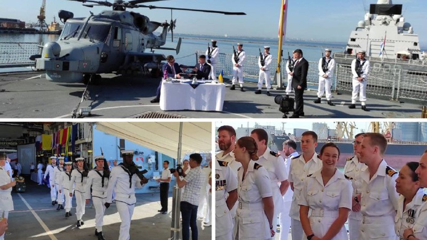 Официальные лица на борту британского ракетного эсминца HMS DEFENDER кроме подписания соглашения наблюдали за совместными учениями украинских, британских и американских военных на борту корабля. Он прибыл в Одессу в прошлую пятницу.