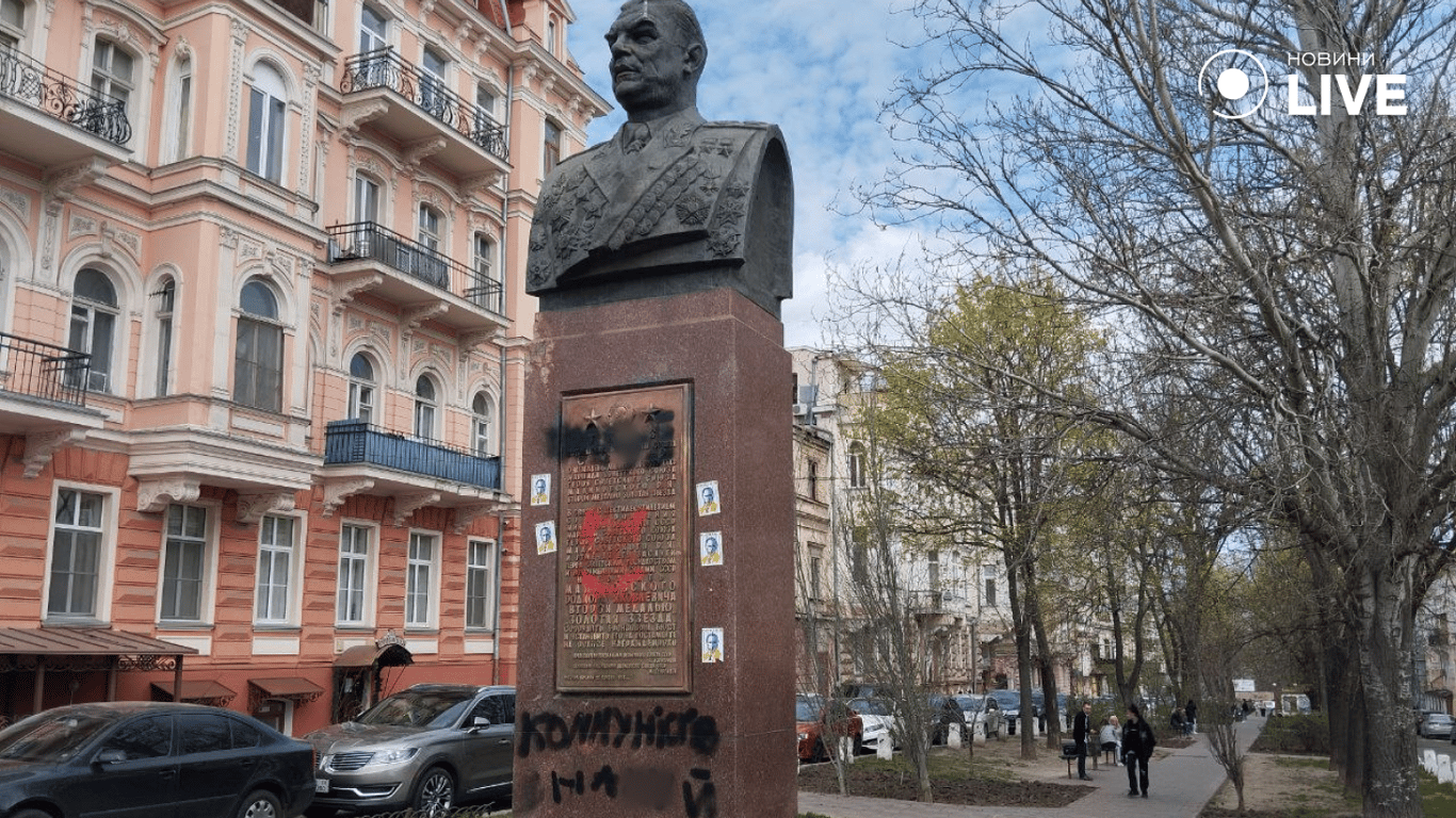 Стикеры с Путиным на памятнике маршала в Одессе. Фото: Новини.LIVE