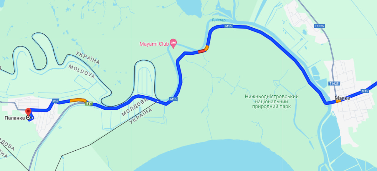 Сейчас в сторону пункта пропуска "Паланка — Маяки — Удобное" есть пробка в районе природного парка и украинского КПП. Этот участок на картах обозначен красным цветом. Путешествие в Паланку продлится сегодня 1 час 14 минут. На самом автомобильном пункте пропуска очередей тоже не наблюдается.