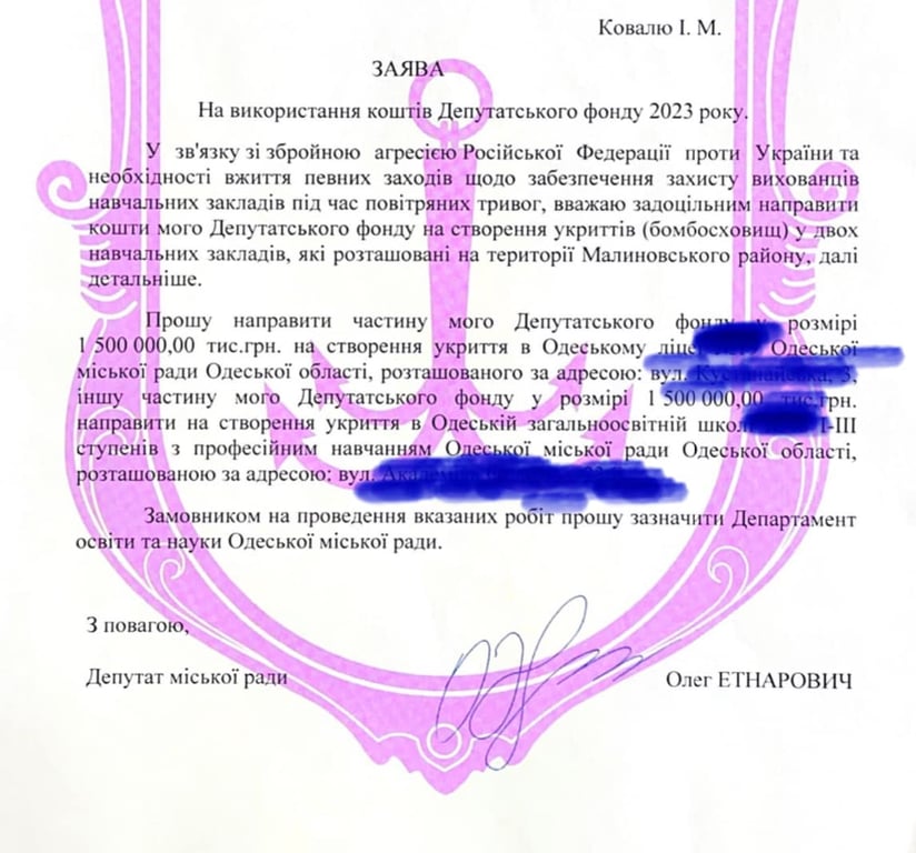 "В связи с вооруженной агрессией рф против Украины и необходимости принятия определенных мер по обеспечению защиты воспитанников учебных заведений во время воздушных тревог, считаю целесообразным направить средства моего депутатского фонда на создание укрытий в двух учебных заведениях", — говорится в депутатском обращении.