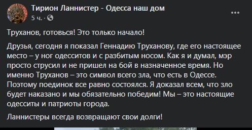 “Я доказал всем, что зло будет наказано и мы обязательно победим! Мы-это настоящие одесситы и патриоты города. Ланнистеры всегда возвращают свои долги", – указано на Facebook-странице персонажа.