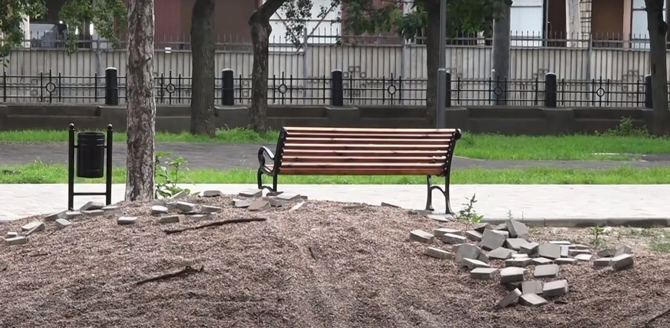 Насыпь щебня и разбросанная плитка - именно так сейчас выглядит Алексеевский сквер, который помпезно открывал мэр Одессы Геннадий Труханов вместе с оркестром. Уже после празднования горожане заметили довольно серьезные различия в реальном виде зеленой зоны и обещанного им мэрией.