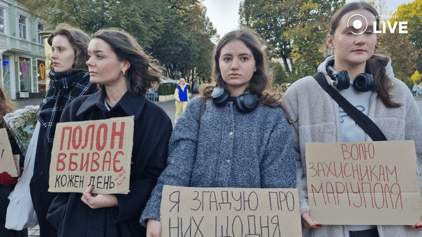 В центре города на Дерибасовской сегодня снова собрались десятки людей — родственники, волонтеры и неравнодушные горожане. Люди держали собственноручно изготовленные плакаты, на которых написаны лозунги: "В плену живые завидуют мертвым", "Будь голосом тех, кто был тебе щитом", "AZOV не дома" и "Верните героев живыми".