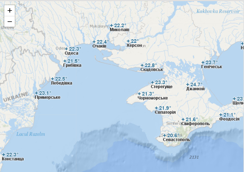 Максимальная температура Черного моря в территориальных водах Украины фиксируется возле Приморского на Одесчине и в Стерегущем в Крыму. Там вода прогрелась до 23,3°С. В Одессе температура ниже всего на один градус и составляет +22,3°С.