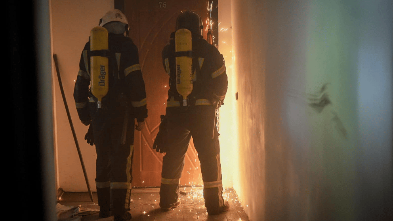 Спасатель тушит огонь. Фото: ГСЧС УкраиныСпасатели заходят в здание, где горит квартира. Фото: ГСЧС Украины
