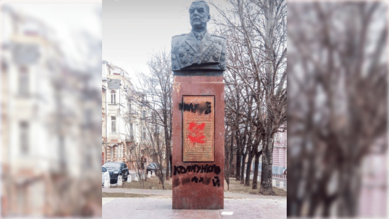 Одесский художник сделал нецензурные надписи на памятнике советскому маршалу Родиону Малиновскому. Он уже не в первый раз разрисовывает сооружение — таким образом художник пытается достичь его сноса.