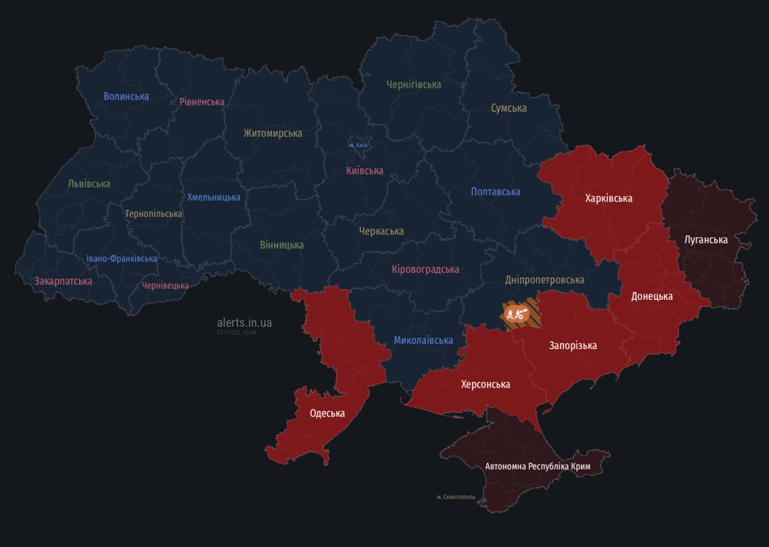 Воздушная тревога объявлена в Одесской, Херсонской, Запорожской, Донецкой и Харьковской областях.