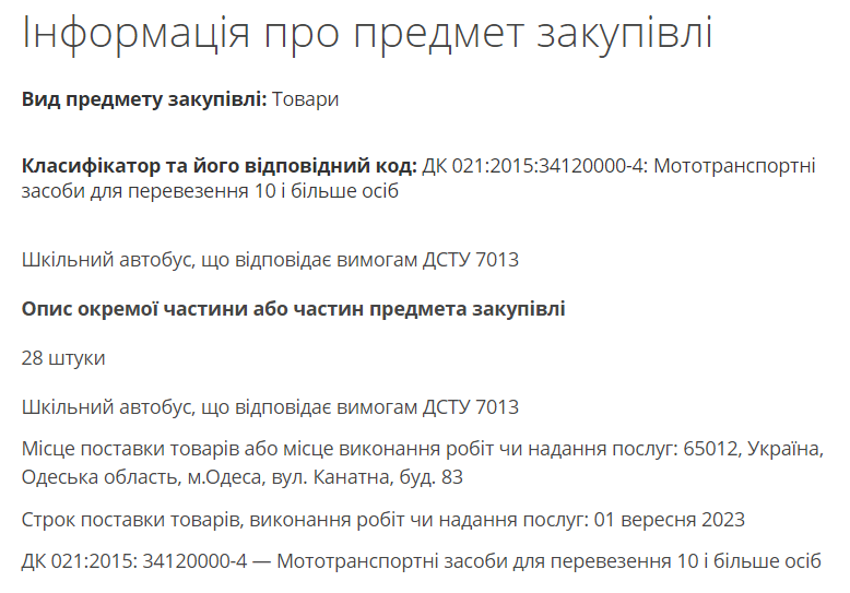 По информации на портале, Департамент образования и науки Одесской ОВА заключил соглашение с обществом с ограниченной ответственностью Торговый дом "Эталон авто" по поставке 28 школьных автобусов. Планируется потратить на это 82 млн грн.