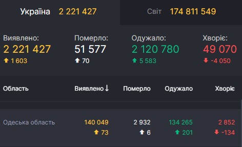 В Украине обнаружили 1 603 новых больных на COVID-19, в 70 случаях болезнь закончилась смертью. Сейчас продолжают болеть 49 070 человек.
