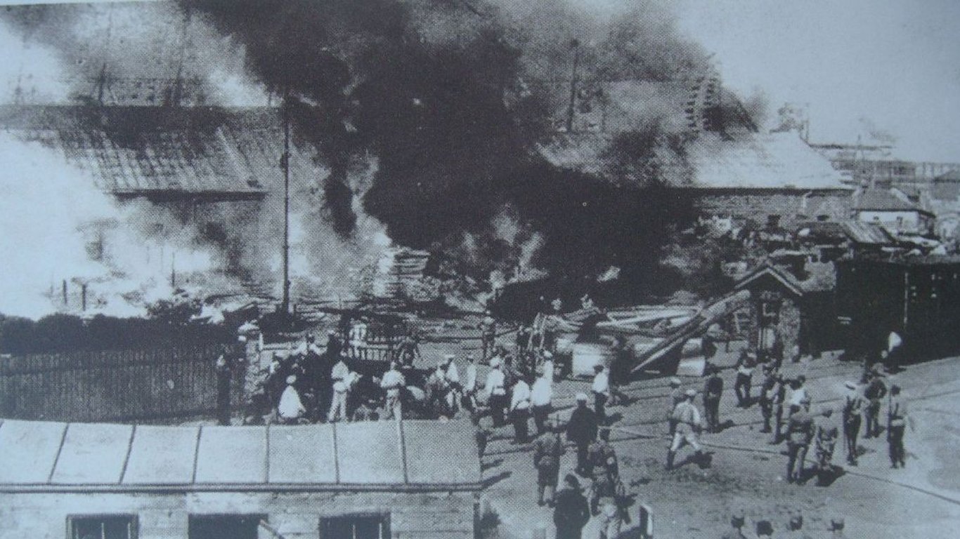 Первый пожар начался на территории Нового мола, а затем и на Практической гавани. Банды, занимавшиеся поджогами, состояли из евреев. Поджоги производились с помощью горючей жидкости. Сила огня была так велика, что железные листы прогорали. Зажигательной жидкостью смазывали свайные ограждения молил, и все они были охвачены огнем. Некоторые даже выливали зажигательную смесь прямо в воду у пароходов и она горела на воде.