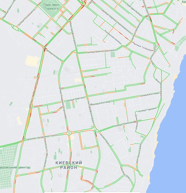 В Киевском районе, как всегда, пробки есть на проспектах Небесной Сотни и Академика Глушко, Люстдорфской и Фонтанской дорогах. Также возможно застрять на улицах Инглези, Левитана, Академика Королева и Костанди.
