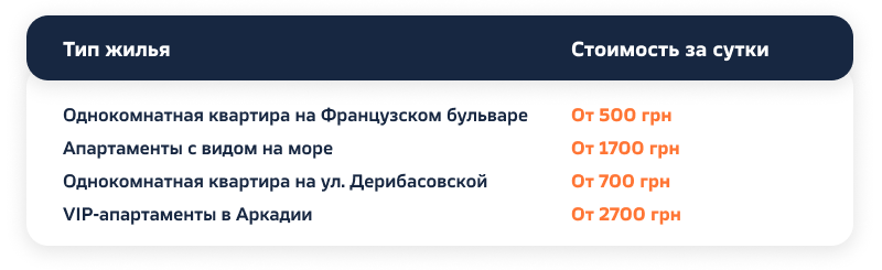 Если раньше далеко не все туристы могли себе позволить апартаменты у моря, сегодня это вполне доступный вариант для большинства населения. Цены на аренду разные: начиная от 500 грн за однокомнатную квартиру. В таком доме будет двуспальная кровать, а также кровать для ребенка. Такое жилье можно снять в Пересыпском районе. Это всегда бюджетный вариант как суточной, так и долгосрочной аренды.
