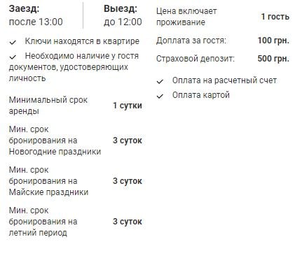 В процессе поисков квартиры стоит обращать особое внимание на 2 "правила проживания": количество гостей и минимальный срок аренды. К примеру, вы видите приличную квартиру за 300 гривен/сутки, и уже готовитесь забронировали ее вместе с друзьями, но при въезде вам скажут, что придется платить 600. Почему? Потому что на сайте было указано, что 300 – это за одного человека, поэтому каждый гость доплачивает. И виновен в излишней переплате будет не собственник, а тот, кто не досмотрел.