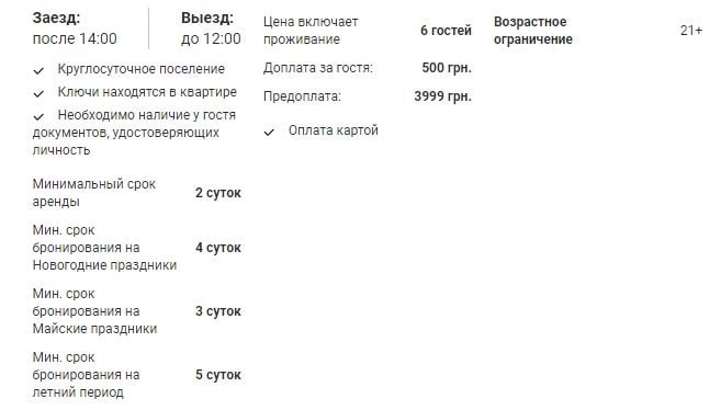 Похожая ситуация с минимальным сроком. Не все квартиры (особенно дешевые) можно снять на сутки. Так, арендодатель может указать минимальное количество дней аренды – 3-5, тогда снова придется платить не 300, а 900 гривен.