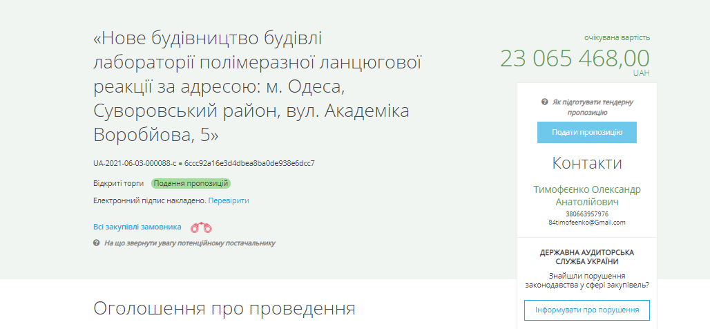 Одесская ОГА объявила тендер на свыше 23 миллионов гривен для новой ПЦР-лаборатории. Ее построят на улице Академика Воробьева, 5, на базе Одесского кожно-венерологического диспансера.