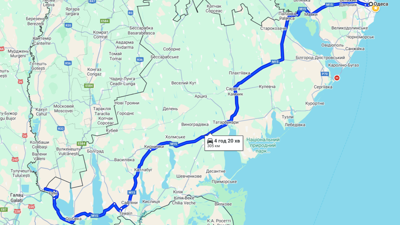 Сейчас в сторону пункта пропуска "Паланка — Маяки — Удобное" есть пробка в районе села Маяки, еще одно скопление машин наблюдается по дороге к КПП. На последнем участке пробка достигает несколько километров, движение транспорта значительно затруднено, и на карте этот участок обозначен красным цветом. Зато участок до КПП "Старокозачье — Тудора" свободен.
