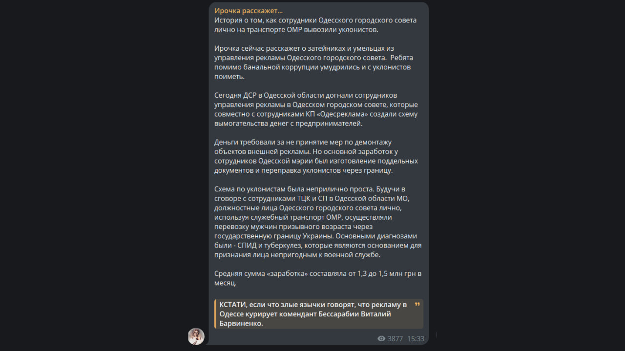 За даними одеської журналістки, одеські чиновники сприяли вивезенню ухилянтів за кордон на службовому транспорті. Таким чином, співробітники одного з підрозділів мерії заробляли до 1,5 мільйона гривень щомісяця.