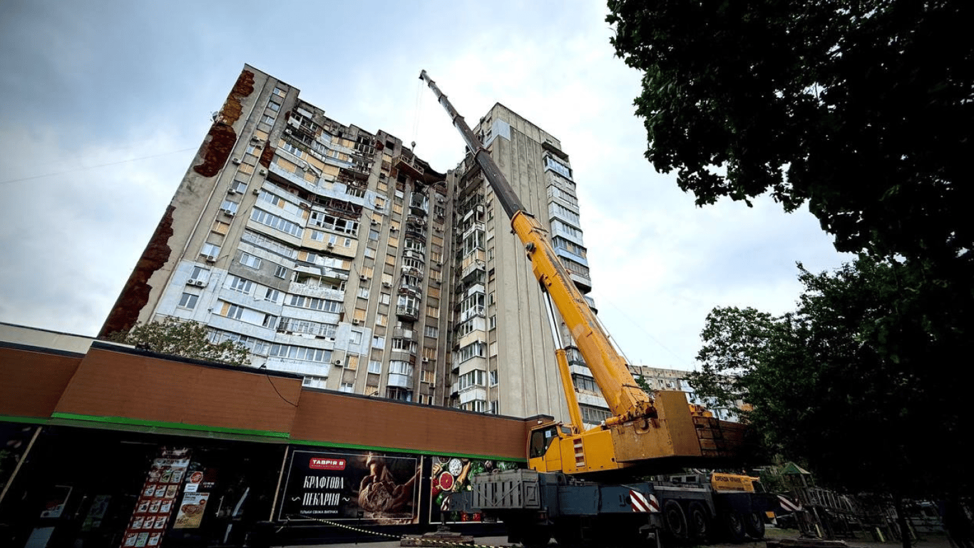 В Одесі стартували протиаварійні роботи в пошкодженому будинку на вулиці Ярослава Мудрого, 2. Для безпечного виконання ремонту на місце доставили потужний кран.