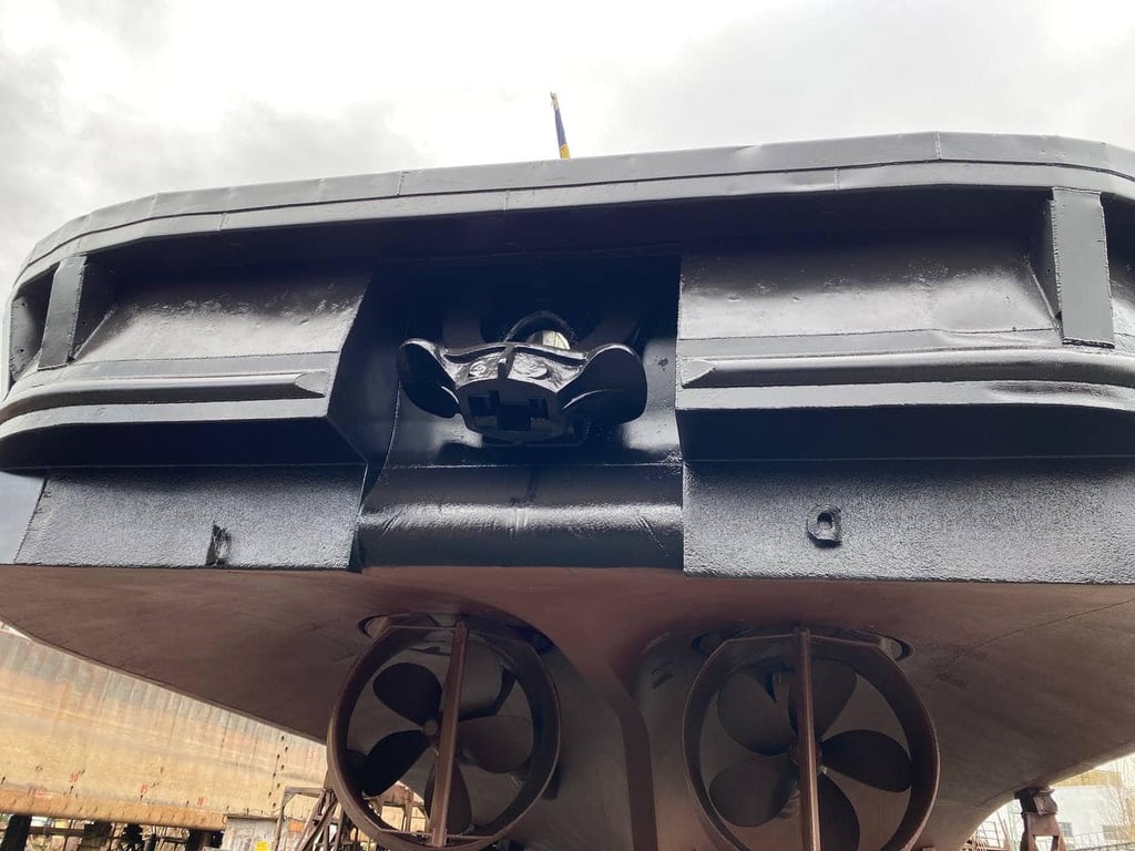 Спеціалісти замінили значну частину металу зовнішньої обшивки корпусу, повністю відремонтований гвинторульовий комплекс із заміною всіх підшипників, зачищений та пофарбували корпус.