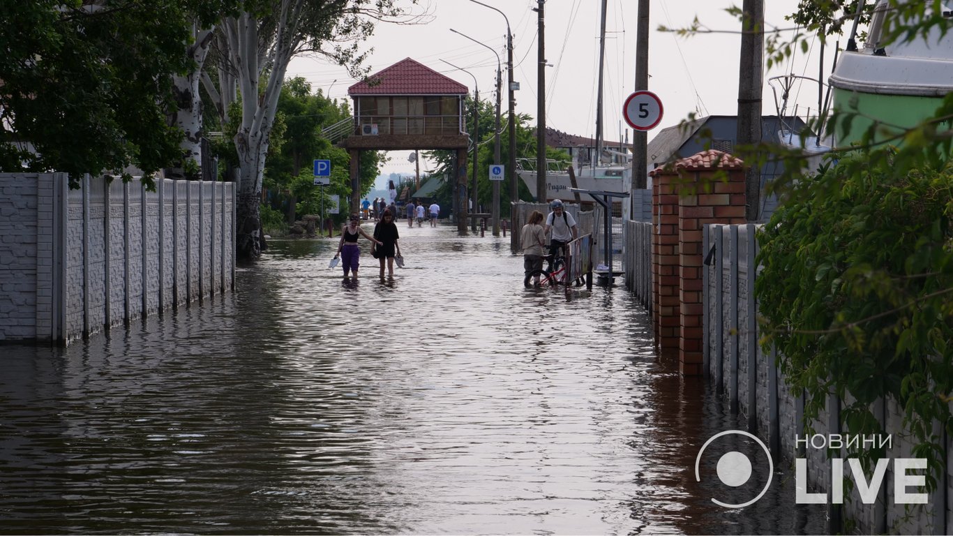 У деяких місцях вода по коліно. Фото: Новини.LIVEЛюди не змінюють свій маршрут під час прогулянки. Фото: Новини.LIVEЗатоплена вулиця в Миколаєві. Фото: Новини.LIVE
