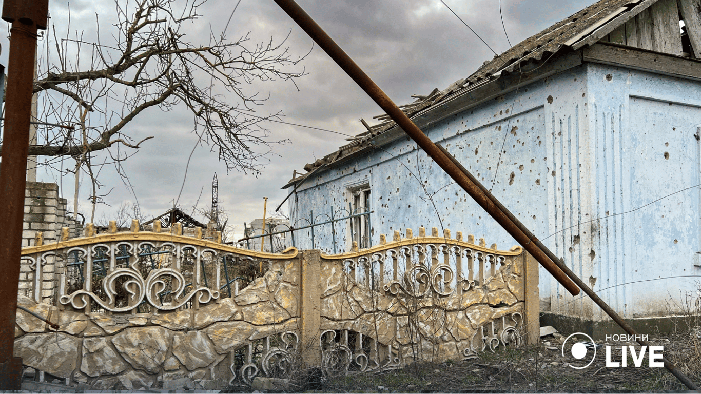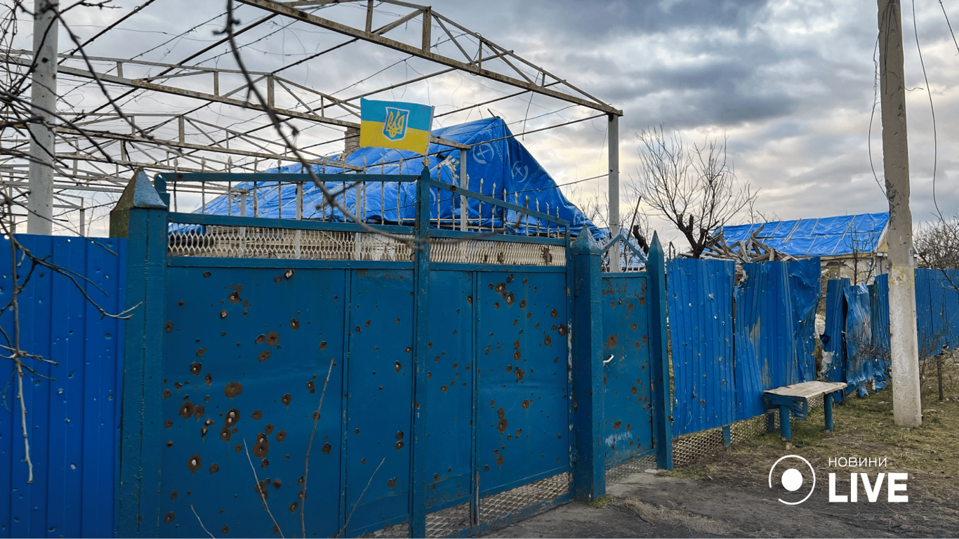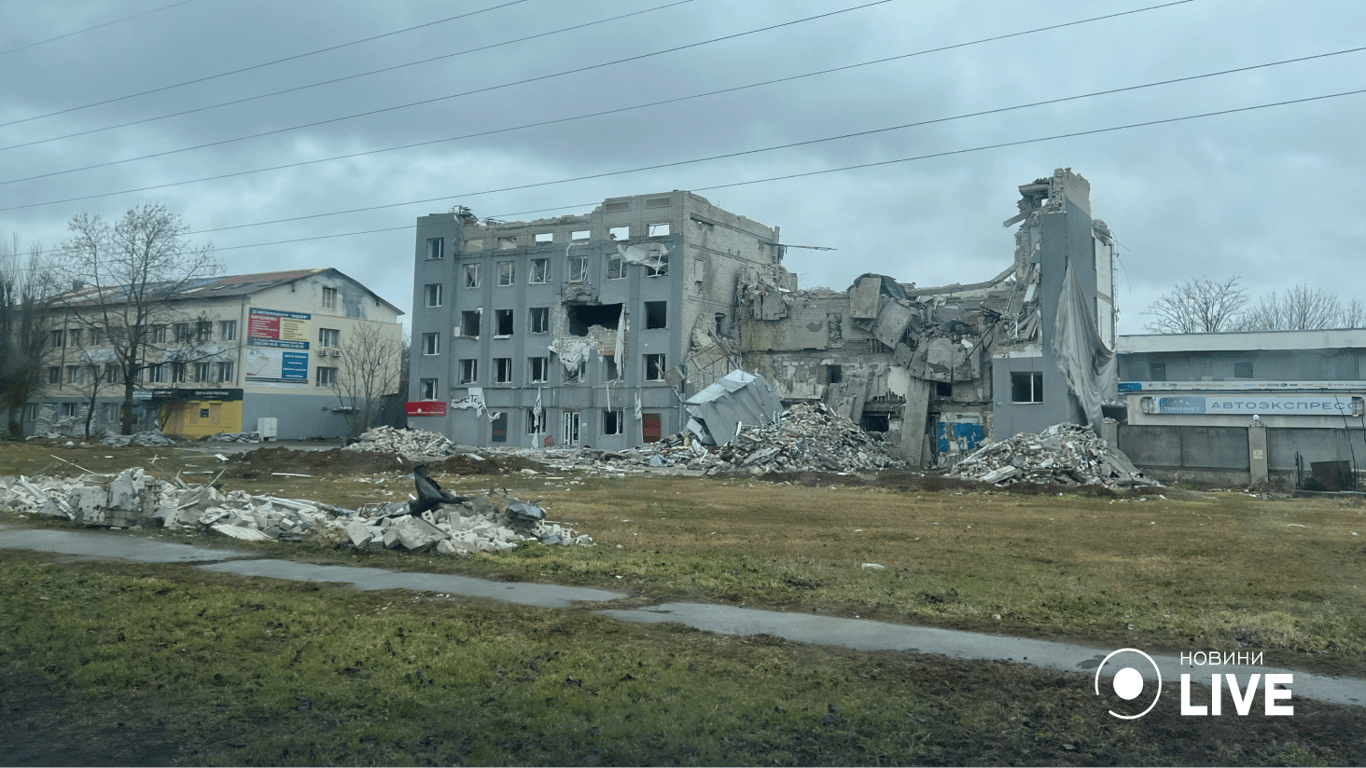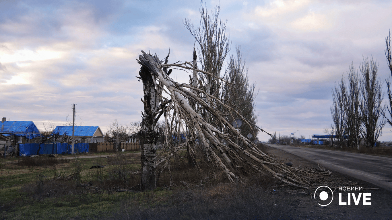 Дорогою до самого Херсона картина ще більш гнітюча. Розвалені будинки, заводи та АЗС. Аби зберегти вціліле, люди перекривають ребра дахів брезентом.