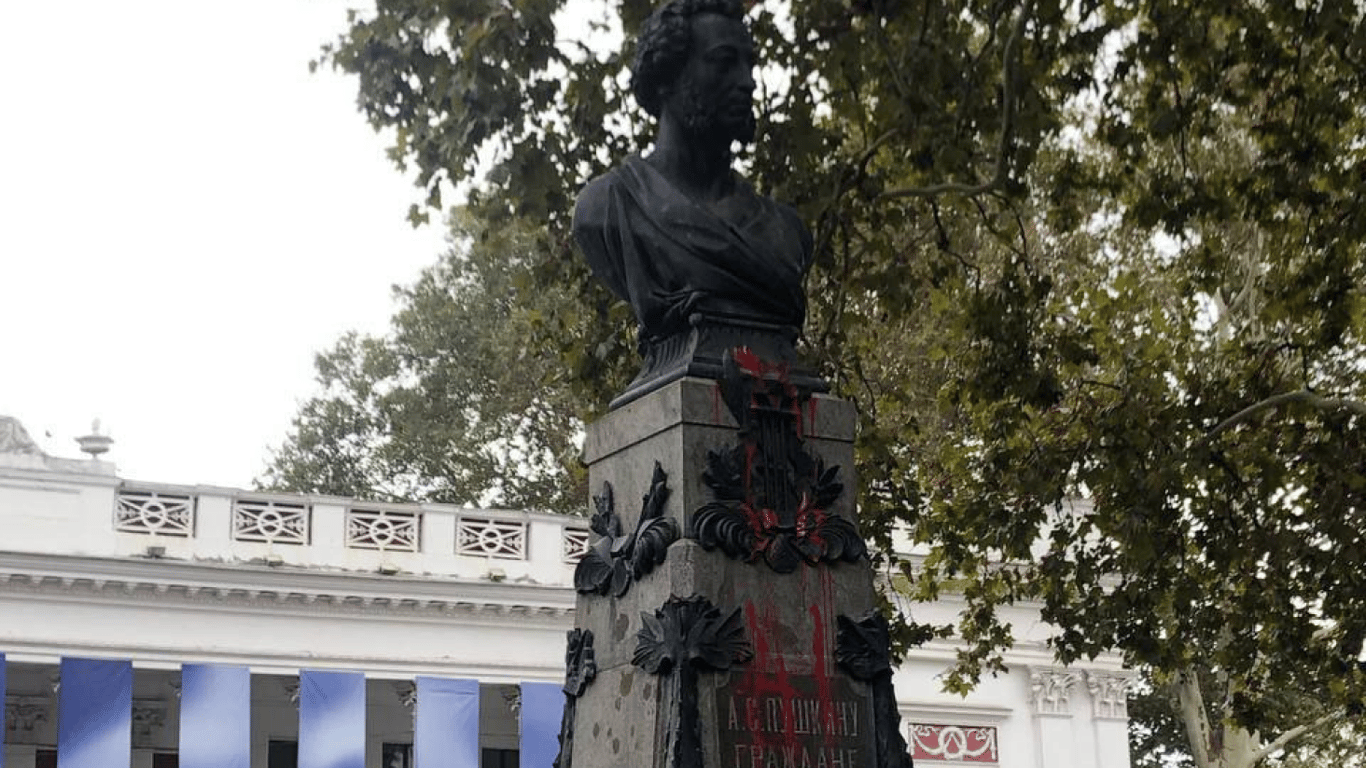 Бюст російського поета Олександра Пушкіна, встановлений перед будівлею Одеської міської ради, розмалювали червоною фарбою. Так активісти закликають демонтувати пам'ятник.